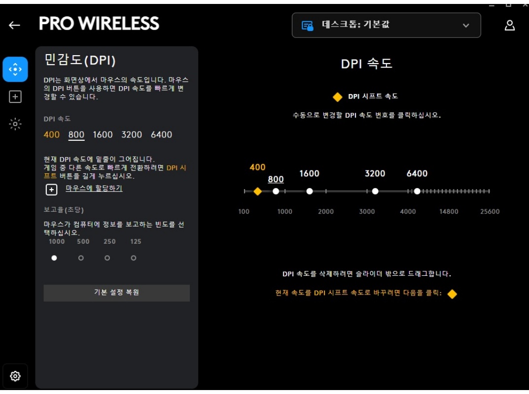 저는 오버워치나 배틀그라운드를 하면서 DPI를 굉장히 중요하게 생각했기 때문에 400, 800, 1600을 사용해 보며 조절하곤 했습니다.