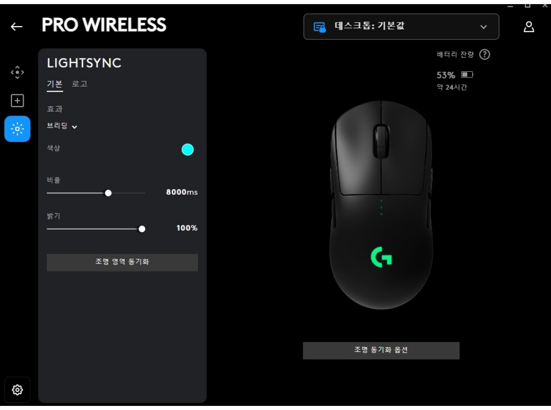 또한, 마우스 로고의 밝기와 색상까지 조절하실 수 있고 배터리 잔량도 확인하실 수 있으니 참고하세요.