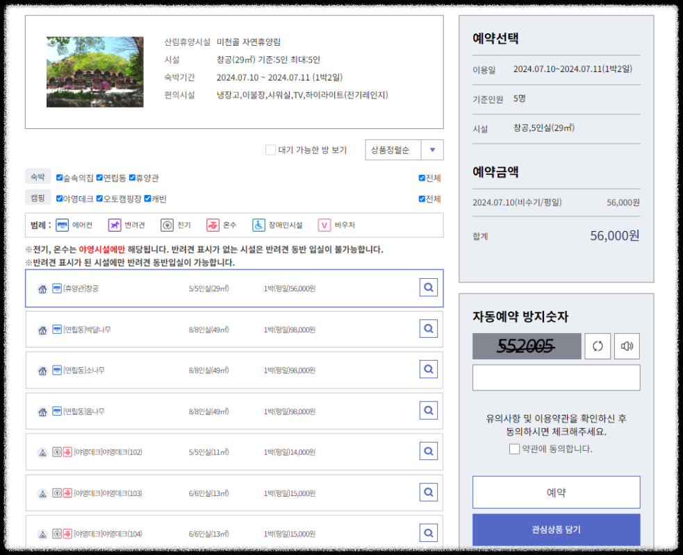 - 지역 · 자연휴양림 ·날짜 ·인원 선택 후 조회